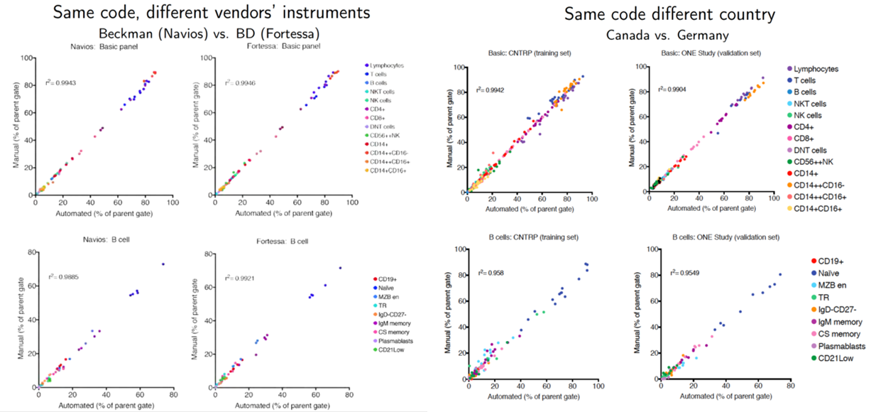 我们开发了一个基于 flowCore 和 flowDensity 的自动化分析工作流程。使用 DuraClone 的干试剂生成数据。预格式化面板抗体鸡尾酒技术(Beckman Coulter)。自动化管道的性能是通过其匹配专家手动分析器(即参考手册)获得的每个事件基础值的能力来评估的,目前被认为是“黄金标准”方法。此外,我们将参考手动值与另外 2 台遵循相同门控策略的手动分析仪获得的值进行了比较。自动分析产生的结果与参考手动分析中获得的结果高度相关。例如,将参考手册与 14 个基本面板细胞群的自动分析进行比较的 Spearman 等级相关系数 [ρ, rs] 均 > 0。8. 大多数 F1 分数中位数 > 0.9,总体 F1 平均值为 0.93。为了证明稳健性,我们从 ONE Study 中获得了一个独立的数据集,该数据集使用相同的抗体面板和荧光强度设置,并通过我们的自动化流程手动重新分析了这些数据。当对两个数据集的所有分析人群进行组合时,自动门控和手动门控之间的相关值均 > 0.9,这表明使用一组数据开发的自动门控管道可以很容易地用于准确分析独立数据,如果它们是使用相同的数据收集的标准化的方法。为了测试分析管道对备用仪器平台的稳健性,我们分析了在 Navios(Beckman Coulter,3 个激光器)或 Fortessa X20(BD Biosciences,4 个激光器)上采集的平行样本,并获得相关值> 0.99。一般来说,我们发现自动门控与参考手册的一致性略低于其他手动门控。与康拉德研究一样,一致性较低,特别是对于低丰度、定义不明确的人群(例如,浆母细胞)。不明确的界限,例如 CD14+ 和 CD14++ 之间(特别是在 CD16+ 人群中)以及 CD16– 和 CD16+ 之间的界限导致手动门控的可变性(手册 1 和手册 2 与参考手册,两者 rs = 0.83),以及如自动与参考手册(rs = 0.83)。