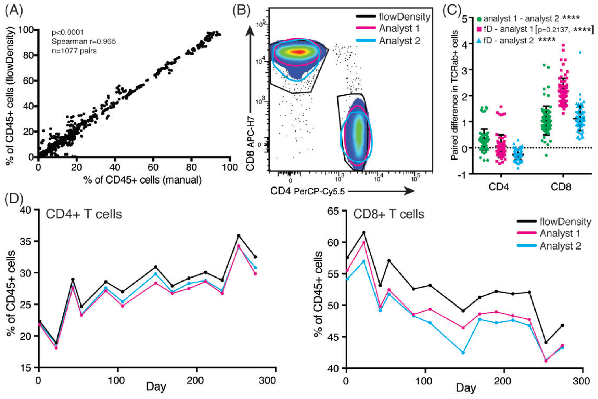 使用识别效应和记忆或辅助和调节 T 细胞的两个染色组生成数据。根据所需的分析深度,使用 8-10 种荧光染料的核心组来识别感兴趣的免疫子集,可以向其中添加三种荧光染料以测量每个患者每个时间点的 6-15 个激活标记。采集后,使用 FlowJo 软件打开 FCS 文件以调整补偿,并将生成的工作空间读入 R 以进行所有进一步的数据处理。虽然已经正确地将重点放在自动门控上,但一旦数据进入计算流,采用自动化方法进行细胞群识别开辟了额外的途径,以提高分析管道内临床试验数据分析的严谨性和可重复性。在使用此类方法完成预浇口质量检查后,然后通过 flowDensity 设置浇口。与倾向于通过同时检查所有维度来识别群体的典型聚类算法不同,flowDensity 基于顺序双变量门控方法,该方法使用为每个感兴趣的细胞群体定制的预先指定的方法生成一组预定义的细胞群体。该算法模拟手动门控步骤,但使用其密度分布的特征(例如密度斜率或密度的两个峰值之间的谷值)为各个标记选择最佳截止值。对于激活标记门控,将设置在荧光上的门边界减去一个对照用于匹配存在荧光染料的样品。根据这些规则为每个数据文件独立设置门。一旦门控步骤的参数化完成,门控步骤由单个脚本按顺序运行,只需要手动输入来指定文件所在的目录和输出的所需位置。只要新数据文件通常与用于设置门边界的数据文件相似,该方法往往是稳健的。然后,本研究测试了具有 flowDensity 的分析管道与领域专家对来自五名患者的数据进行的手动门控相比的执行情况。在总共 33 个时间点(每个时间点 2-4 次测试)上对相同的 11 个感兴趣的人群进行手动和自动分析,产生 1,077 个匹配的人群。这些群体的比较显示了 T 细胞面板的手动和自动分析之间的显着相关性(见下文)。虽然大部分人口表现出强烈的一致性,但通过自动分析对事件很少的人口进行手动门控并没有那么紧密地匹配。较大的分歧主要归因于该群体中的少量事件(门位置的微小变化对较小的细胞群体的影响被放大),其次是群体之间缺乏分辨率(即涂片)。当控制不用于此类稀有人群时,通常没有客观信息可用于指导自动化或门控。这使得对此类细胞群的自动分析方法的评估尤其具有挑战性。尽管存在这些差异,
